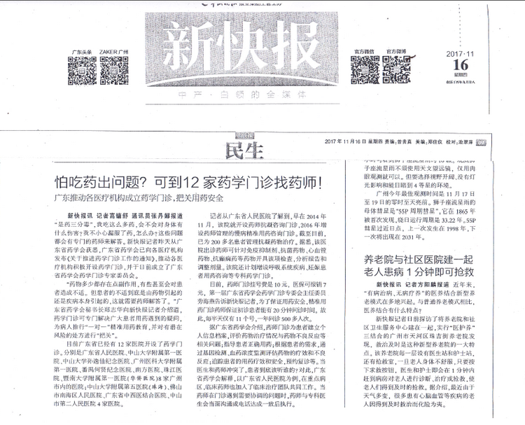2017年11月16日,《新快報(bào)》以“怕吃藥出問(wèn)題?可到12家藥學(xué)門診找藥師”為題,詳細(xì)報(bào)道了廣東省藥學(xué)會(huì)推動(dòng)各級(jí)醫(yī)療機(jī)構(gòu)成立藥學(xué)門診系列工作。