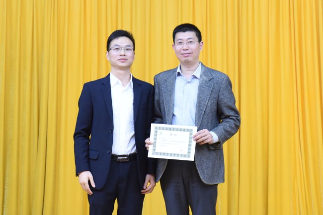 廣東省藥學(xué)會(huì)學(xué)術(shù)部副主任 王勇(左一)為常務(wù)副主任委員陳吉生(右一)頒發(fā)聘書