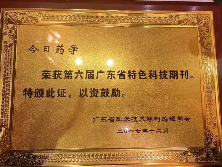 《今日藥學(xué)》雜志榮獲“第六屆廣東省特色科技期刊”