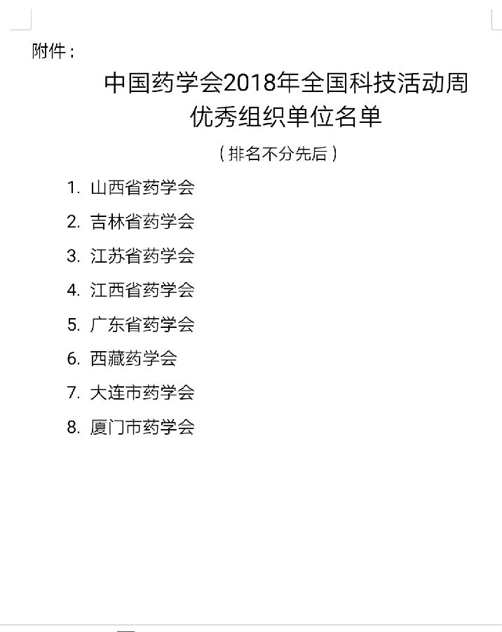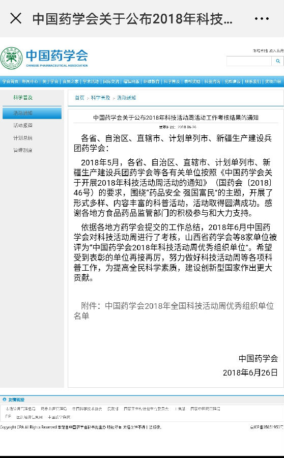 表彰文件見(jiàn)中國(guó)藥學(xué)會(huì)官網(wǎng)2018年6月26日:“中國(guó)藥學(xué)會(huì)關(guān)于公布2018年科技活動(dòng)周活動(dòng)工作考核結(jié)果的通知”http://www.cpa.org.cn/?do=info&cid=74716
