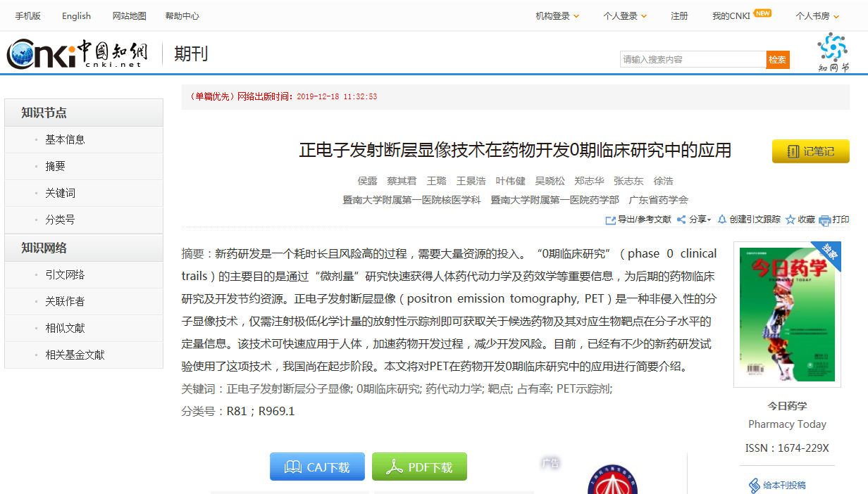 近日,暨南大學(xué)附屬第一醫(yī)院核醫(yī)學(xué)科聯(lián)合藥學(xué)部、廣東省藥學(xué)會,在《今日藥學(xué)》發(fā)表綜述性論文“正電子發(fā)射斷層顯像技術(shù)在藥物開發(fā)0期臨床研究中的應(yīng)用”,根據(jù)國際藥物開發(fā)模式,在國內(nèi)首次正式提出利用PET分子影像進(jìn)行藥物開發(fā)0期臨床研究的概念。核醫(yī)學(xué)科徐浩教授為通訊作者,研究生侯露同學(xué)為第一作者?;匦铀倨鱌ET藥物中心王璐博士、藥學(xué)部王景浩博士、廣東省藥學(xué)會副理事長兼秘書長鄭志華主任藥師對該工作給予了重要指導(dǎo)。