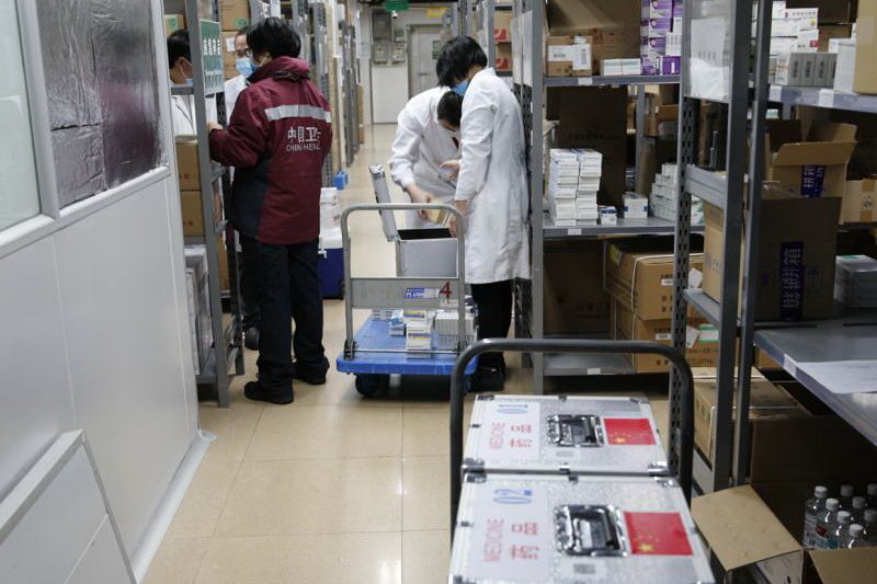 本會理事、國際應(yīng)急醫(yī)療隊隊員、省二醫(yī)院藥物臨床試驗機構(gòu)盧慧勤主任,藥學(xué)部張聰副主任藥師(重癥醫(yī)學(xué)臨床藥師)、吉家興主管藥師(呼吸專業(yè)臨床藥師)三位藥學(xué)隊員接到任務(wù)后,在藥學(xué)部國家級青年文明號號手們的積極支援下,半小時就完成了藥品抽組任務(wù),并進行了緊張的藥品準備。本次醫(yī)療救援隊共攜帶藥品近7噸。