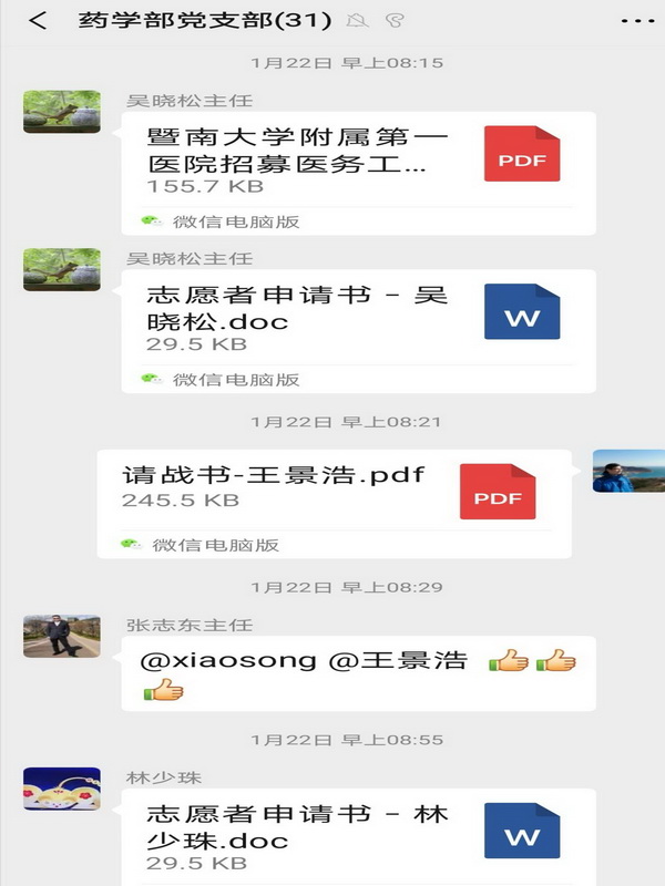 1月21日,吳曉松主任帶領(lǐng)張志東、王景浩、林少珠、吳玲、李康憲、黎少鵬等7位具有豐富經(jīng)驗(yàn)的藥師,率先向院里提交了“請(qǐng)戰(zhàn)書”,志愿加入防治新型冠狀病毒工作團(tuán)隊(duì),為抗擊疫情,作出自已的貢獻(xiàn)。