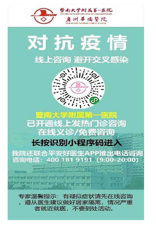 2、暨南大學(xué)附屬第一醫(yī)院(廣東省藥學(xué)會(huì)藥物治療學(xué)專業(yè)委員會(huì)副主任委員單位):長(zhǎng)按識(shí)別小程序碼進(jìn)入-進(jìn)入網(wǎng)上咨詢界面-點(diǎn)擊“新型冠狀病毒疫情”-在出診列表中選擇藥師、咨詢用藥相關(guān)問(wèn)題。