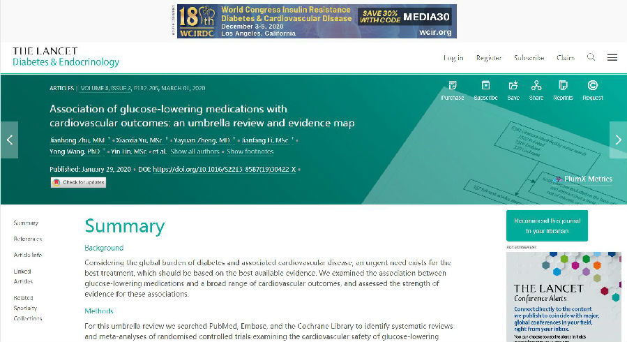 近期,中山大學孫逸仙紀念醫(yī)院藥學部在伍俊妍主任的帶領(lǐng)下,由朱建紅主管藥師為第一作者,廣東省藥學會王勇主管藥師亦作為共同第一作者,伍俊妍主任藥師為通訊作者,撰寫的《降糖藥心血管安全性的證據(jù)圖研究》一文發(fā)表在最新一期的《柳葉刀-糖尿病及內(nèi)分泌學》:Association of glucose-lowering medications with cardiovascular outcomes: an umbrella review and evidence map (Lancet Diabetes Endocrinol 2020;8(3):192-205.)。該論文以“Article”形式發(fā)表在Lancet Diabetes Endocrinol雜志,文章來源:https://www.thelancet.com/journals/landia/article/PIIS2213-8587(19)30422-X/fulltext。