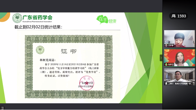 2021年2月6日,《廣東省藥學(xué)會(huì)處方審核能力網(wǎng)絡(luò)培訓(xùn)》線上班第三期結(jié)業(yè)儀式以線上直播的方式成功舉辦。