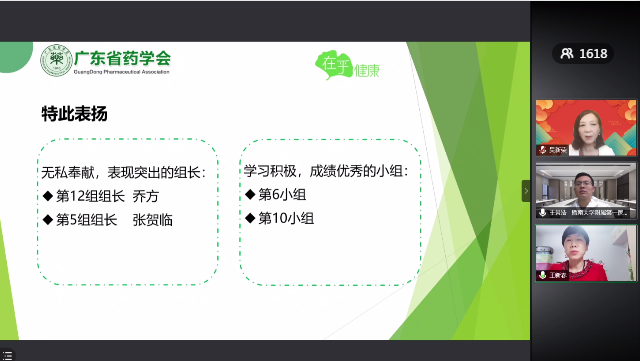 接下來,大家通過視頻回顧了《廣東省藥學(xué)會(huì)處方審核能力網(wǎng)絡(luò)培訓(xùn)》線上三期班在學(xué)習(xí)過程中的精彩瞬間。隨后,廣東省藥學(xué)會(huì)審方培訓(xùn)項(xiàng)目的總督導(dǎo)吳新榮主任宣讀了總成績排在前十名的優(yōu)秀學(xué)員名單并對他們表示祝賀!