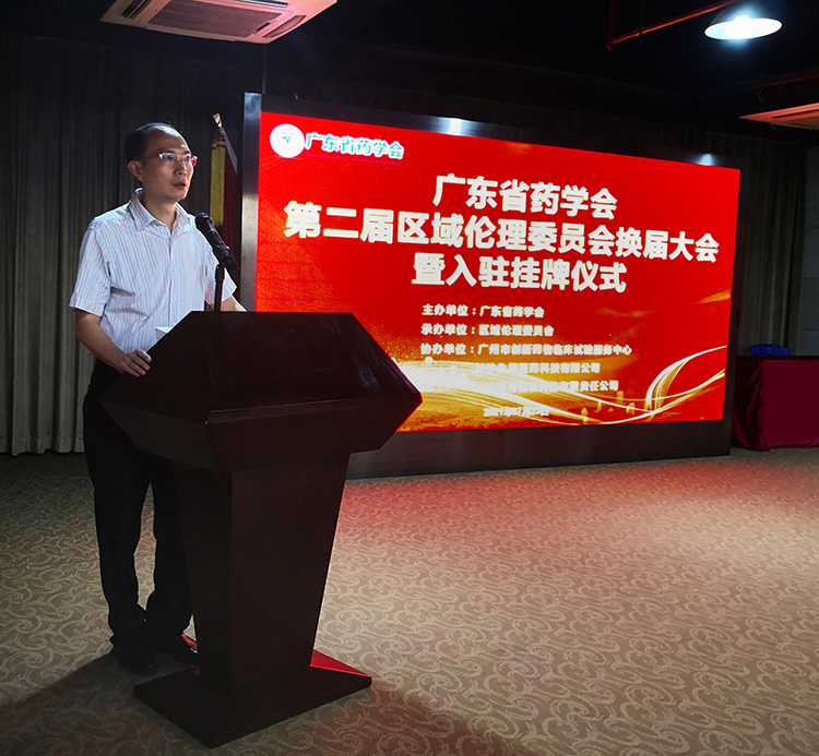 廣東省藥學(xué)會鄭志華副理事長兼秘書長致辭并宣讀廣東省藥學(xué)會第二屆區(qū)域倫理委員會成立通文