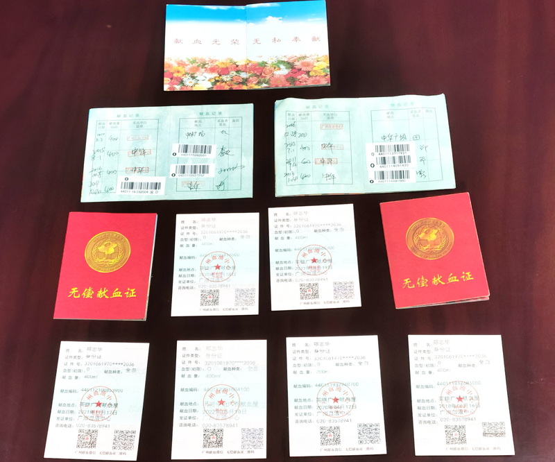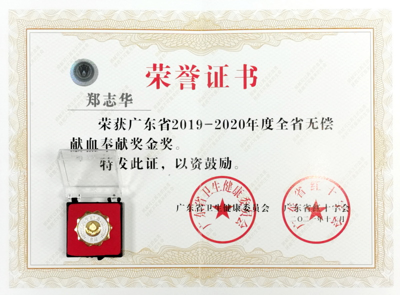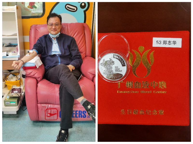 鄭志華同志自2001年開(kāi)始第一次無(wú)償獻(xiàn)血以來(lái),至今已連續(xù)獻(xiàn)血20年,從最先每年1次、每次200毫升到近五年來(lái)每年2次分上、下半年,每次400毫升,從未間斷,已先后共無(wú)償獻(xiàn)血24次,累計(jì)獻(xiàn)血總量達(dá)8600毫升。等于將全身生命之源的血液無(wú)償獻(xiàn)出2輪。真正的熱血奉獻(xiàn)、不計(jì)回報(bào),其精神令人欽佩!其中2021年11月17日,在他生日的當(dāng)天還前往中華廣場(chǎng)獻(xiàn)血點(diǎn)獻(xiàn)出400毫升,并獲贈(zèng)銀質(zhì)紀(jì)念章。在他的影響下,廣東省藥學(xué)會(huì)秘書(shū)處半數(shù)以上人員也都踴躍參與無(wú)償獻(xiàn)血公益事業(yè)。