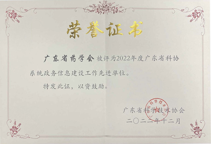 廣東省藥學(xué)會(huì)榮獲2022年度省科協(xié)系統(tǒng)政務(wù)信息建設(shè)工作先進(jìn)單位