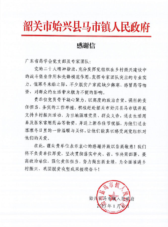 為認真貫徹落實黨的二十大精神,響應(yīng)黨中央、國務(wù)院鄉(xiāng)村振興號召,充分發(fā)揮黨組織在鄉(xiāng)村振興建設(shè)中的戰(zhàn)斗堡壘作用和先鋒模范作用,發(fā)揮專家團隊突出的專業(yè)實力,將安全用藥、合理用藥知識送到基層,將黨和政府對廣大鄉(xiāng)村的關(guān)懷、關(guān)愛送到基層,2023年1月6日,新年伊始,廣東省藥學(xué)會黨支部會同粵北人民醫(yī)院門診第三黨支部、廣州國盈醫(yī)藥有限公司黨總支、阿斯利康廣州黨支部一道,前往粵北始興縣馬市鎮(zhèn),開展“送醫(yī)送藥進鄉(xiāng)村?真情幫扶暖民心”主題黨日活動。