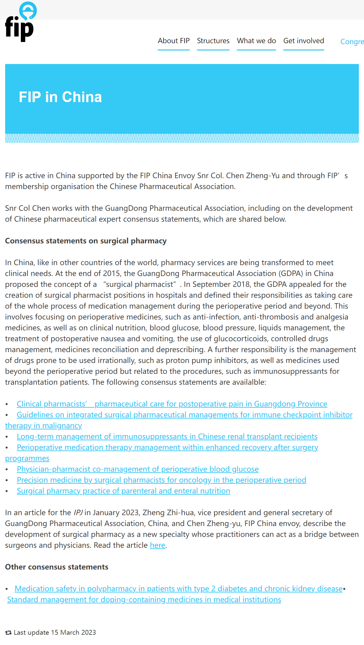 近日,國(guó)際藥學(xué)聯(lián)合會(huì)(FIP)在其全球網(wǎng)站(www.fip.org)開設(shè)了“Pharmacy in China”專欄(https://www.fip.org/pharmacy-in-china),其中刊登了由中國(guó)藥學(xué)專家最新撰寫的9個(gè)藥學(xué)專家共識(shí),分享給全球的400多萬(wàn)藥師、藥學(xué)科研工作者和藥學(xué)教育專家。2023年1月,廣東省藥學(xué)會(huì)副理事長(zhǎng)兼秘書長(zhǎng)鄭志華與FIP中國(guó)總代表、FIP院士陳征宇聯(lián)合在FIP官方雜志《International Pharmacy Journal》發(fā)表了 "Surgical pharmacy — a new specialty to expand pharmacists’ role in surgical care"一文,向國(guó)際藥學(xué)界介紹了外科藥學(xué)這一新興學(xué)科,此次登載的7個(gè)專家共識(shí)專注于外科藥學(xué)領(lǐng)域,因此網(wǎng)站專門增設(shè)了“外科藥學(xué)”專欄。7個(gè)共識(shí)如下: