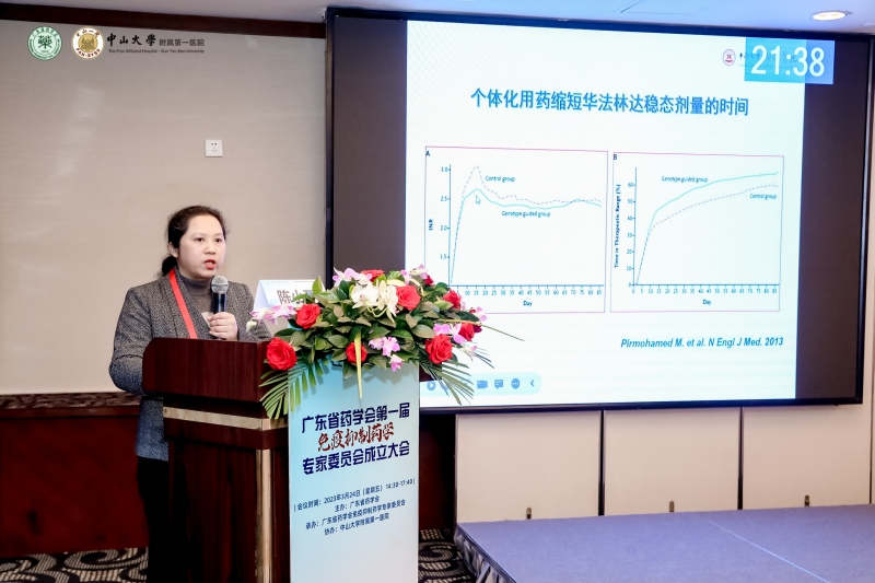 成立大會(huì)結(jié)束后進(jìn)入學(xué)術(shù)報(bào)告環(huán)節(jié),本環(huán)節(jié)共邀請(qǐng)到三位專家授課。首先是中山大學(xué)藥學(xué)院的王雪丁教授介紹免疫抑制藥物的個(gè)體化用藥熱點(diǎn)進(jìn)展,王教授著重分享硫唑嘌呤藥物在炎癥性腸病的個(gè)體化用藥科研成果;隨后,中山大學(xué)附屬第一醫(yī)院夏延哲教授分享新藥來(lái)特莫韋治療巨細(xì)胞病毒感染的臨床研究數(shù)據(jù),其創(chuàng)新作用機(jī)制靶向病毒末段酶,強(qiáng)化藥效的同時(shí)也提升安全性;接下來(lái),中南大學(xué)湘雅醫(yī)院陳小平教授結(jié)合自身研究成果,分享心血管疾病的藥物基因組學(xué)與個(gè)體化用藥,報(bào)告以藥物基因組與藥物反應(yīng)的個(gè)體差異和抗血小板治療面臨的主要臨床問(wèn)題為主要對(duì)象,分別從華法林、他汀類和氯吡格雷等藥物的臨床療效和用法用量進(jìn)行闡述。