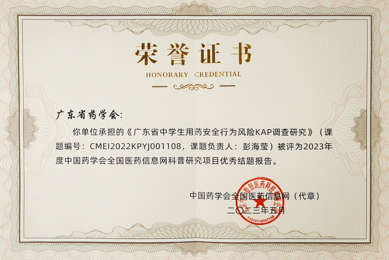 近日,中國藥學會科技開發(fā)中心公布了全國醫(yī)藥信息網(wǎng)科普研究項目2023 年結(jié)題驗收結(jié)果。廣東省藥學會彭海瑩(工作單位:南部戰(zhàn)區(qū)總醫(yī)院)課題《廣東省中學生用藥安全行為風險 KAP 調(diào)查研究》和中山市中醫(yī)院葉秋明課題《互聯(lián)網(wǎng)藥學服務對腦卒患者二級預防的干預影響》榮獲優(yōu)秀結(jié)題報告。