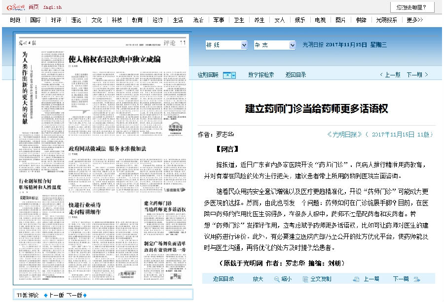 圖8 2017年11月《光明日報》報道了廣東的藥師門診