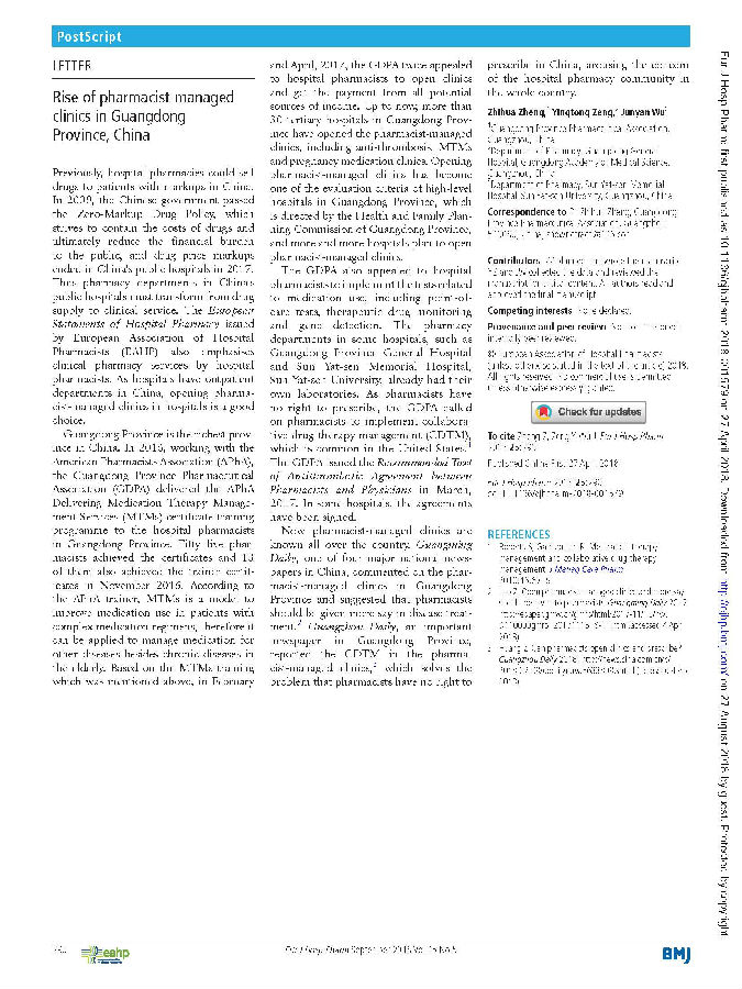 圖10 2018年4月《歐洲醫(yī)院藥學雜志》(European Journal of Hospital Pharmacy)發(fā)表了廣東藥學門診建設成果