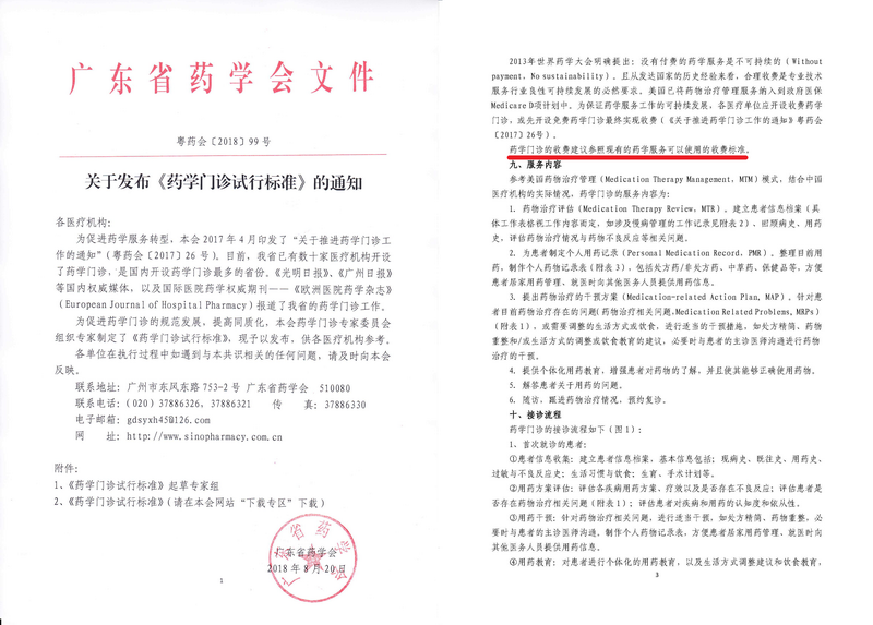圖11 2018年8月廣東省藥學會《藥學門診試行標準》再次強調了收費的重要性