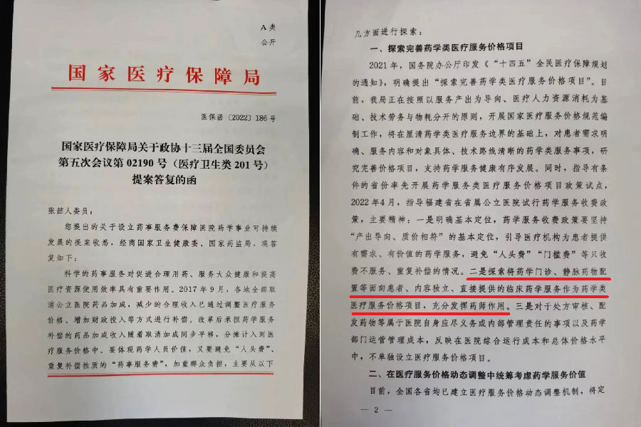 2022年9月,國家醫(yī)療保障局在答復政協(xié)張喆人委員關于設立藥事服務費保障醫(yī)院藥學事業(yè)可持續(xù)發(fā)展的提案中指出,探索將藥學門診、靜脈藥物配置等面向患者、內容獨立、直接提供的臨床藥學服務作為藥學類醫(yī)療服務價格項目,充分發(fā)揮藥師作用。