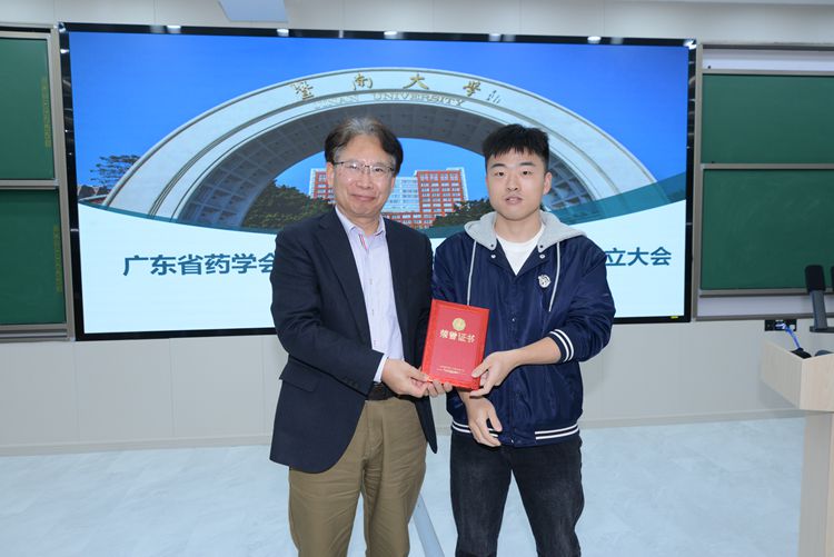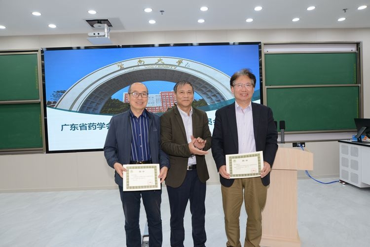 廣東省藥學(xué)會(huì)陳民喜書(shū)記兼執(zhí)行秘書(shū)長(zhǎng)給章偉光、高昊頒發(fā)聘書(shū)