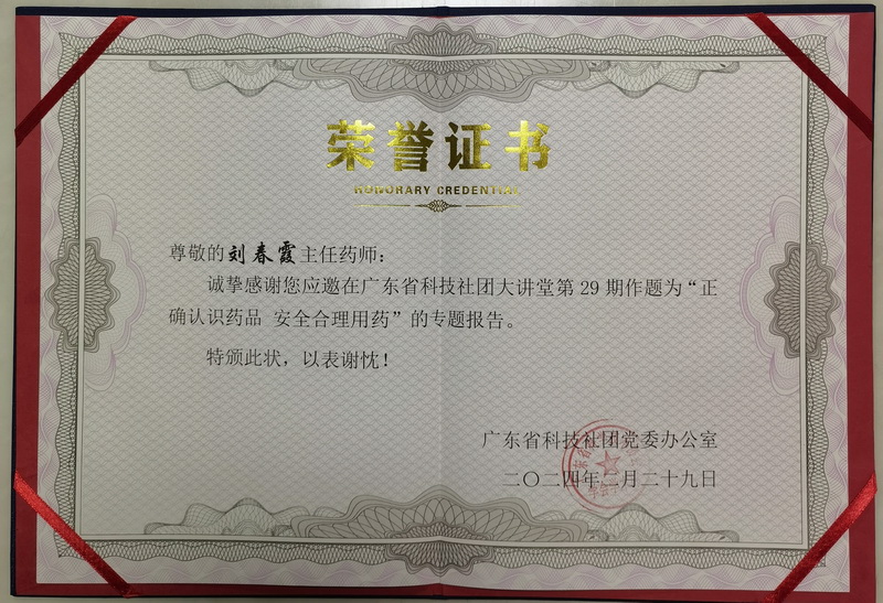 2月29日下午,本會(huì)藥學(xué)科普專家委員會(huì)主任委員劉春霞應(yīng)邀到廣東省科技社團(tuán)大講堂,做健康科普講座,主題:《正確認(rèn)識(shí)藥品 安全合理用藥》。