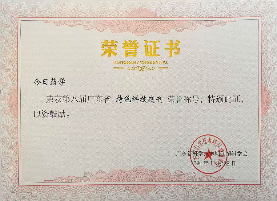 《今日藥學(xué)》雜志榮獲“第八屆廣東省特色科技期刊”