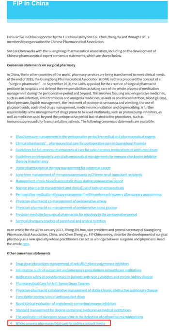 南方醫(yī)科大學(xué)珠江醫(yī)院王勇主任團(tuán)隊主筆的《碘對比劑全程化藥學(xué)服務(wù)共識》在國際藥學(xué)聯(lián)合會(FIP)官網(wǎng)發(fā)表