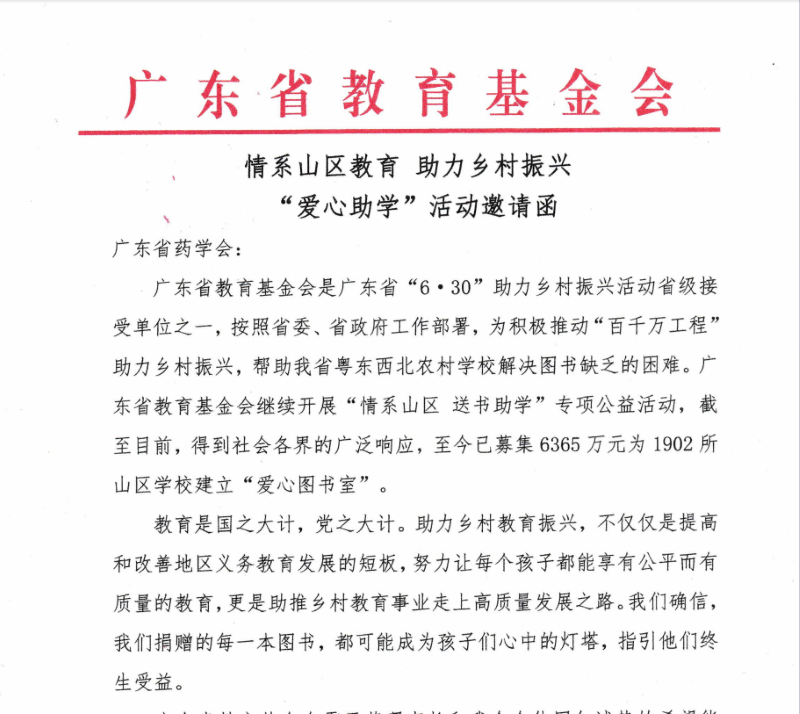 廣東省藥學(xué)會(huì)繼續(xù)積極支持我省“百千萬(wàn)工程-情系山區(qū)送書(shū)助學(xué)”專項(xiàng)公益活動(dòng),助推我省粵東西北鄉(xiāng)村教育事業(yè),支持學(xué)校建設(shè)書(shū)香校園,以實(shí)際行動(dòng)為我省革命老區(qū)、邊遠(yuǎn)山區(qū)教育事業(yè)添磚加瓦、奉獻(xiàn)愛(ài)心,彰顯社會(huì)責(zé)任與社會(huì)擔(dān)當(dāng)。