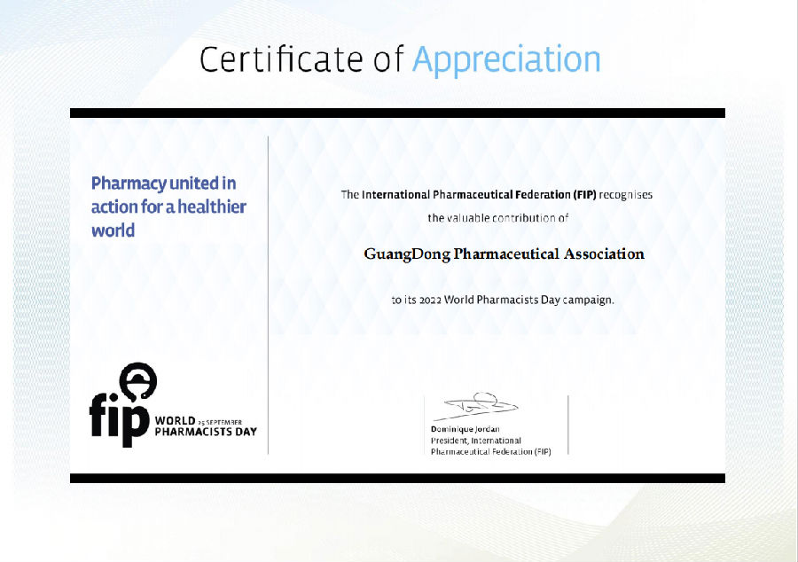 廣東省藥學(xué)會2022年獲FIP授予“9.25世界藥師節(jié)”推廣貢獻(xiàn)獎