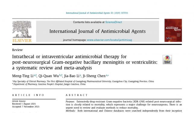 近日,廣東藥科大學附屬第一醫(yī)院藥學部陳吉生教授團隊在國際權(quán)威傳染病學雜志——《國際抗菌藥物雜志》(International Journal of Antimicrobial Agents,IF 10.8,JCR Q1)發(fā)表外科藥學論文——“神經(jīng)外科術(shù)后革蘭氏陰性細菌性腦膜炎或腦室炎的鞘內(nèi)或腦室內(nèi)抗菌治療:一項系統(tǒng)...發(fā)布時間:2024-01-16 17:21:50 | 瀏覽:1294 -