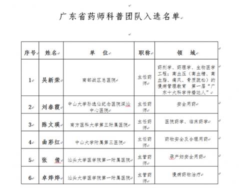 祝賀廣東省藥師科普團(tuán)隊(duì)6人入選廣東科普講師團(tuán)名單