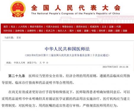 《中華人民共和國(guó)醫(yī)師法》(以下簡(jiǎn)稱(chēng)醫(yī)師法)即將于2022年3月1日起正式施行,首次將診療指南和循證醫(yī)學(xué)證據(jù)下的超藥品說(shuō)明書(shū)用藥寫(xiě)入法條。新醫(yī)師法明確了醫(yī)師在特殊情況下可以采用具有循證醫(yī)學(xué)證據(jù)的超藥品說(shuō)明書(shū)用法的權(quán)利,為醫(yī)師基于循證醫(yī)學(xué)證據(jù)進(jìn)行超說(shuō)明書(shū)用藥提供了法律保障。新醫(yī)師法首次將超說(shuō)明書(shū)用藥寫(xiě)入法條但新《醫(yī)師法...發(fā)布時(shí)間:2022-02-25 17:04:03 | 瀏覽:7176 -