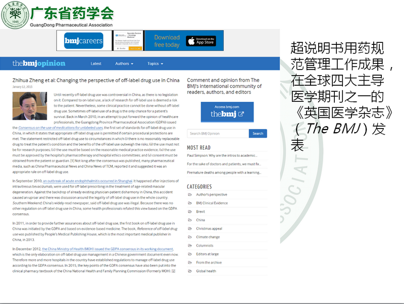 2016年1月,全球四大醫(yī)學(xué)期刊之一的《英國(guó)醫(yī)學(xué)雜志》(The BMJ)以“改變中國(guó)超說(shuō)明書(shū)用藥的觀念(Changing the perspective of off-label drug use in China)”為題刊發(fā)了廣東省藥學(xué)會(huì)關(guān)于超藥品說(shuō)明書(shū)用藥規(guī)范管理工作成果。