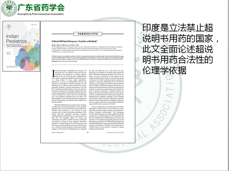 印度是立法禁止超說(shuō)明書(shū)用藥的國(guó)家,因此印度醫(yī)學(xué)會(huì)在《英國(guó)醫(yī)學(xué)雜志》呼吁賦予醫(yī)生超說(shuō)明書(shū)用藥的處方權(quán)。為發(fā)揚(yáng)人類(lèi)大愛(ài)精神,聲援印度同道,分享廣東省藥學(xué)會(huì)超說(shuō)明書(shū)用藥規(guī)范管理工作成果,廣東省藥學(xué)會(huì)于2017年6月在印度權(quán)威醫(yī)學(xué)期刊——《印度兒科》(Indian Pediatrics)以“符合倫理的超說(shuō)明書(shū)用藥:需要重新考慮?(Ethical off-label drug use: need for a rethink?)”為題撰文,提出 “法律正義源于倫理正義,因此符合倫理的超說(shuō)明書(shū)用藥應(yīng)被視為合法”,以及“任何阻止患者獲得最佳治療的法律都是壞法律”的觀點(diǎn)。