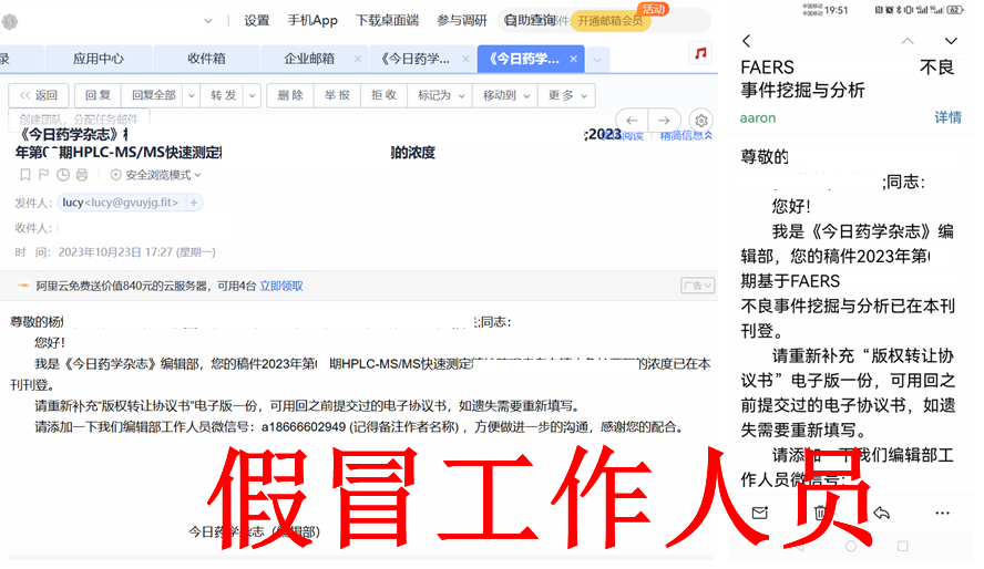 近日,已有多人反映,有人以郵件通知形式(假冒郵箱:lucy@gvuyjg.fit、zhuangbian8926@vip.163.com等)冒稱《今日藥學(xué)》雜志編輯部工作人員,聲稱已刊發(fā)的論文需補充“版權(quán)轉(zhuǎn)讓協(xié)議”等文件,要求作者添加其個人微信,伺機套取作者信息、實施行騙或進行其他不法行為。為此,本刊特聲明如下: