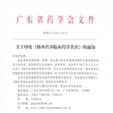 各醫(yī)療機構(gòu):臨床營養(yǎng)是繼麻醉、消毒、抗生素之后外科領(lǐng)域的第四個最具里程碑意義的發(fā)明。臨床營養(yǎng)又分為腸內(nèi)、腸外營養(yǎng)。本會曾于2012年6月8日印發(fā)了《腸內(nèi)營養(yǎng)臨床藥學(xué)共識》,在行業(yè)內(nèi)取得較好的反響。腸外營養(yǎng)因其能快速補充患者營養(yǎng)而受到重視,但又因其安全性要求較高而備受關(guān)注。為充分發(fā)揮臨床藥師在腸外營養(yǎng)管理中的作用,本...發(fā)布時間:2015-12-30 16:20:15 | 瀏覽:2214 -