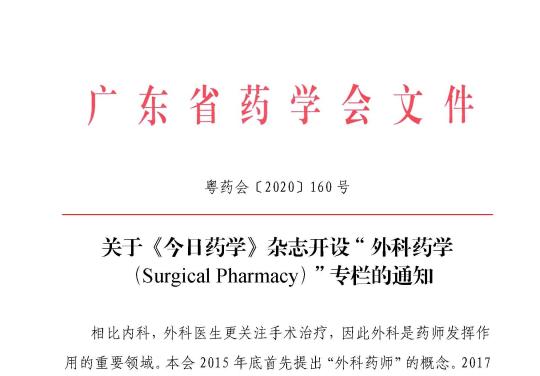 關(guān)于《今日藥學(xué)》雜志開設(shè)“外科藥學(xué)(Surgical Pharmacy)”專欄的通知